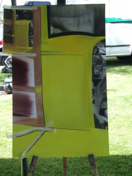 It really caught my eye so I did a live airbrush auto portrait of the cowl and front part of the woodwork at the public Show and Shine.